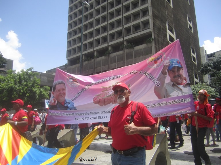 Caminando me encontré con una marcha de chavistas acarriados con pancartas, afiches, banderas, franelas, gorras alusivas a "misiones" de su partido de gobierno.